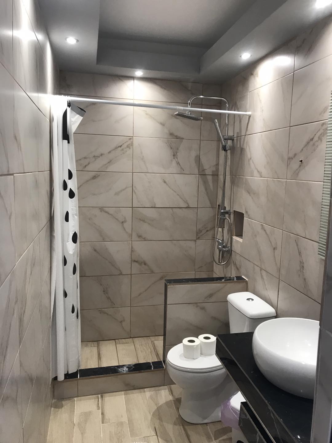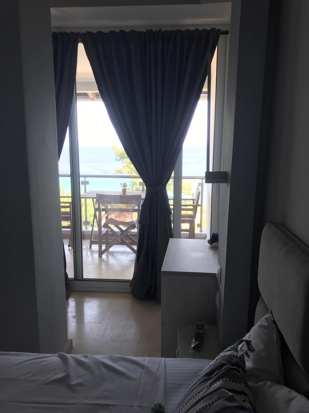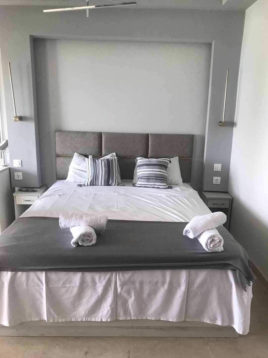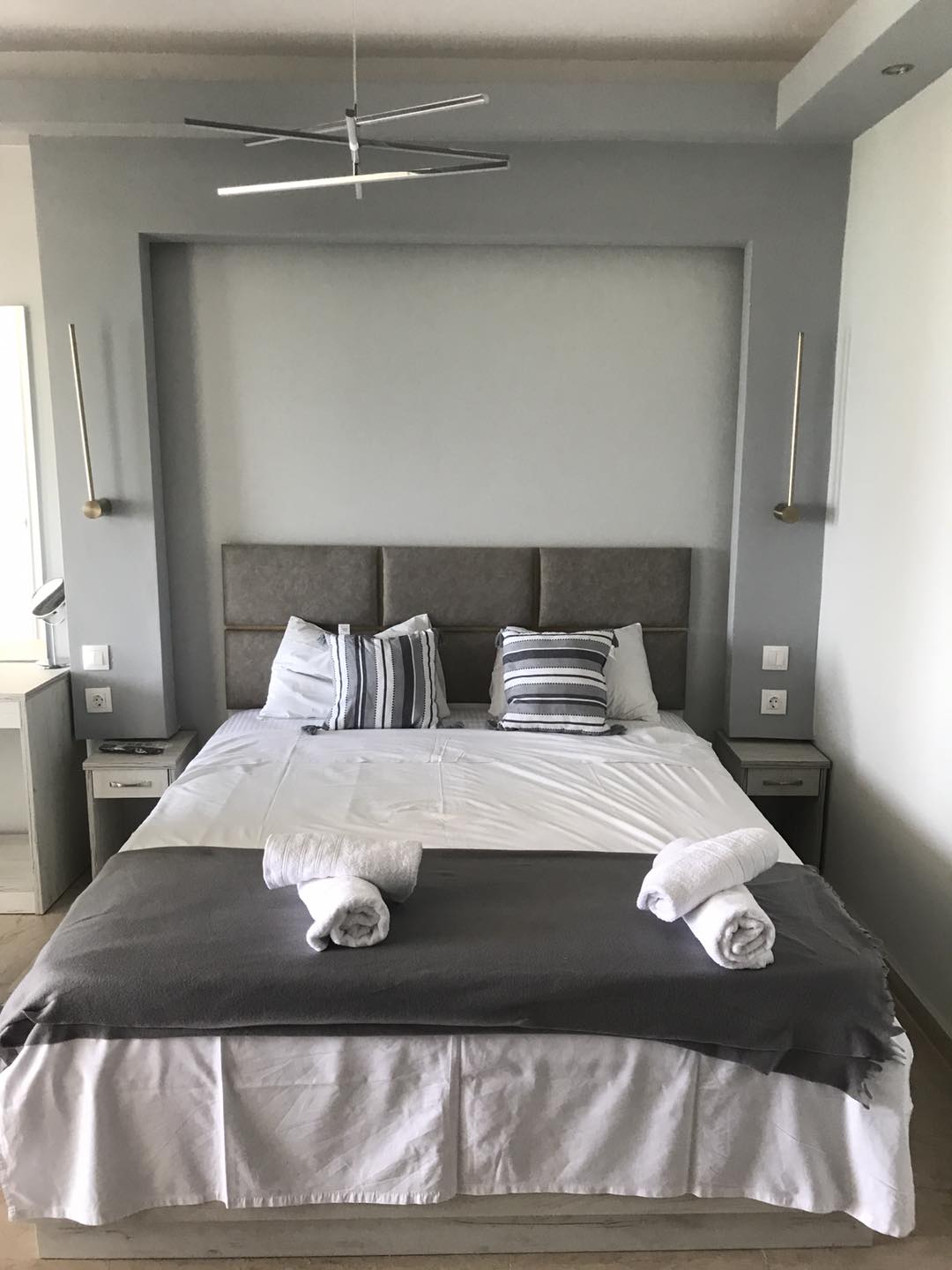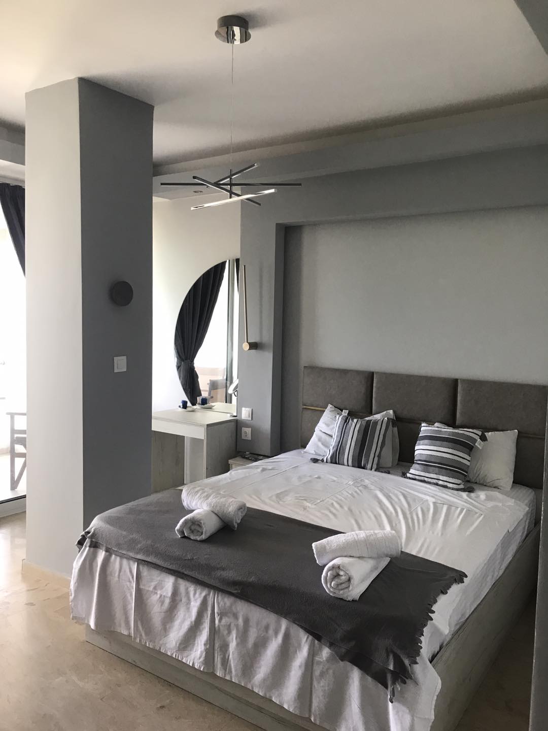 The rooms with 4 beds consists of one double bed and two single beds, one small couch with table, bathroom with shower or bathtub, air condition, one big wardrobe, big kitchen equipped with necessary tools, fridge, oven, common balcony with view to the sea.